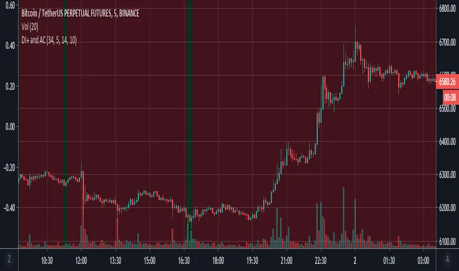 This script utilizes the Directional Movement Plus from the Directional Movement Index and Accelerator Oscillator (developed by Bill Williams to be based off of the Awesome Oscillator ) indicator to determine an entry signal. When the DI+ goes to a low value (<= 10), there is a high probability that a downtrend reversal may occur. The Accelerator Oscillator ( AC ) is used to compliment this theory by looking at the strength of the trend. As the AC shows weakening downtrend acceleration, we can confirm a potentional long entry.
