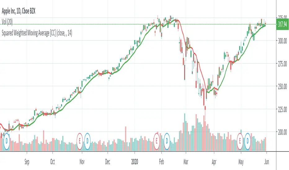 The Squared Weighted Moving Average is similar to the classic Weighted Moving Average but the difference is that it squares the weights instead of the classic weight values. Buy if the indicator line is green and sell when it goes red.
