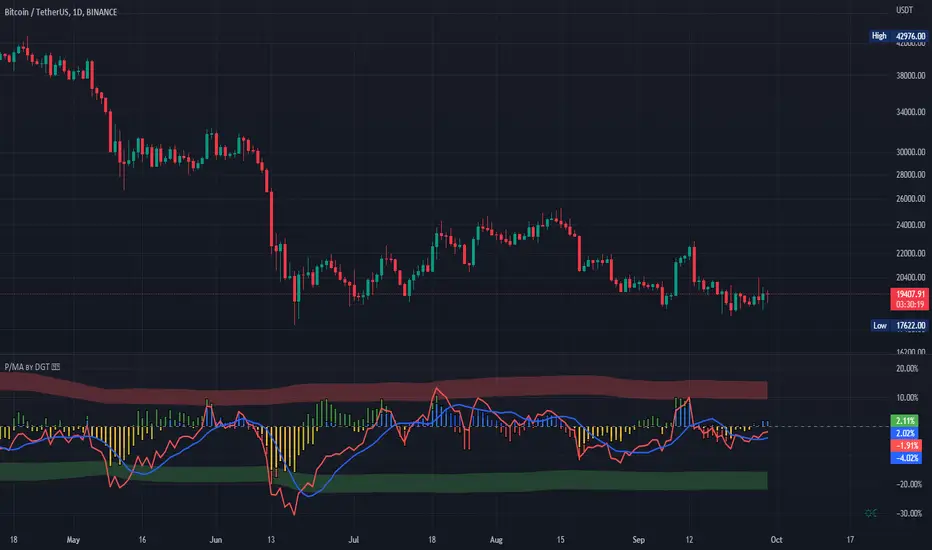 Price Distance to its MA (P/MA) study when look closely you will observe similarities to The Relative Strength Index (RSI). Because of its similarity to RSI, the P/MA can be used in a similar wayOver bought and over sold levels needs to be adjusted based on the market. For crypto it is suggested 25/-25 (default setting) for forex and stocks 10/-10