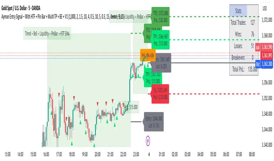 Ayman Entry Signal – With HTF + Pin Bar + Multi TP + BE + Stats Panel (V1)