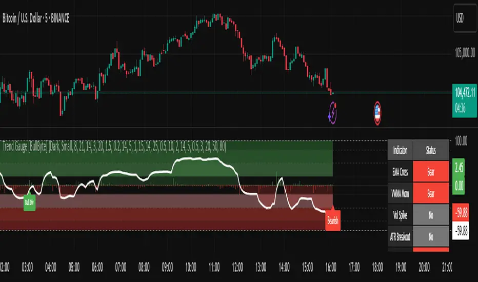 Traders often monitor several indicators in parallel - EMAs, volume signals, volatility breakouts, higher-timeframe trends, ADX readings, divergence alerts, etc., which can be cumbersome and sometimes contradictory. The “Trend Gauge” indicator was created to consolidate these complementary checks into a single, normalized score that reflects the prevailing market bias (bullish, bearish, or neutral) and its strength. By combining multiple inputs with an adaptive regime filter, scaling contributions by magnitude, and penalizing weakening signals (divergence), this tool aims to reduce noise, highlight genuine trend opportunities, and warn when momentum fades.