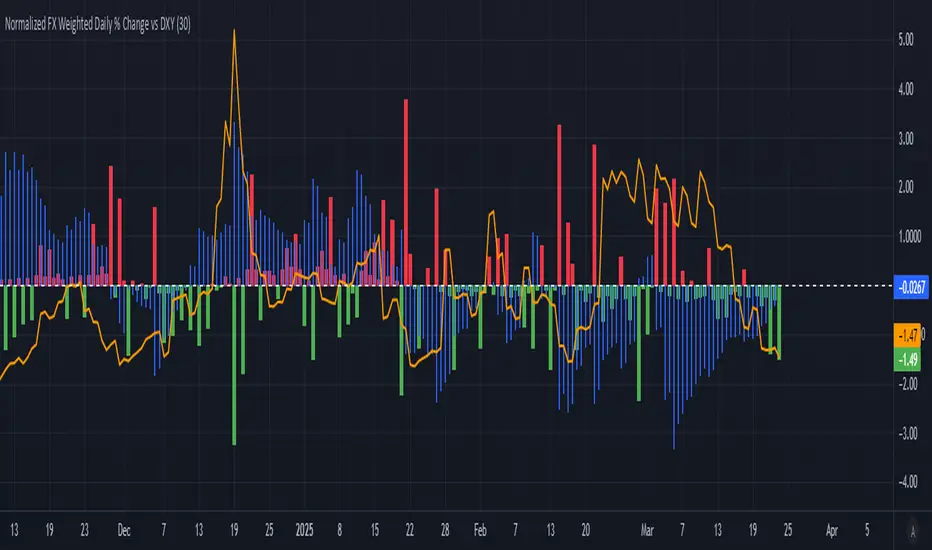 This indicator tracks international liquidity flows by measuring the USD’s relative strength against major currencies—EUR, CNY, JPY, GBP, and CAD. It calculates the weighted percentage change of each pair over a specified interval. A positive reading means the USD is weakening (liquidity flowing out of the US), while a negative reading indicates the USD is strengthening (liquidity flowing in). Additionally, the indicator incorporates the DXY index and VIX, with all components normalized using Z-scores for clear, comparable insights into market dynamics.