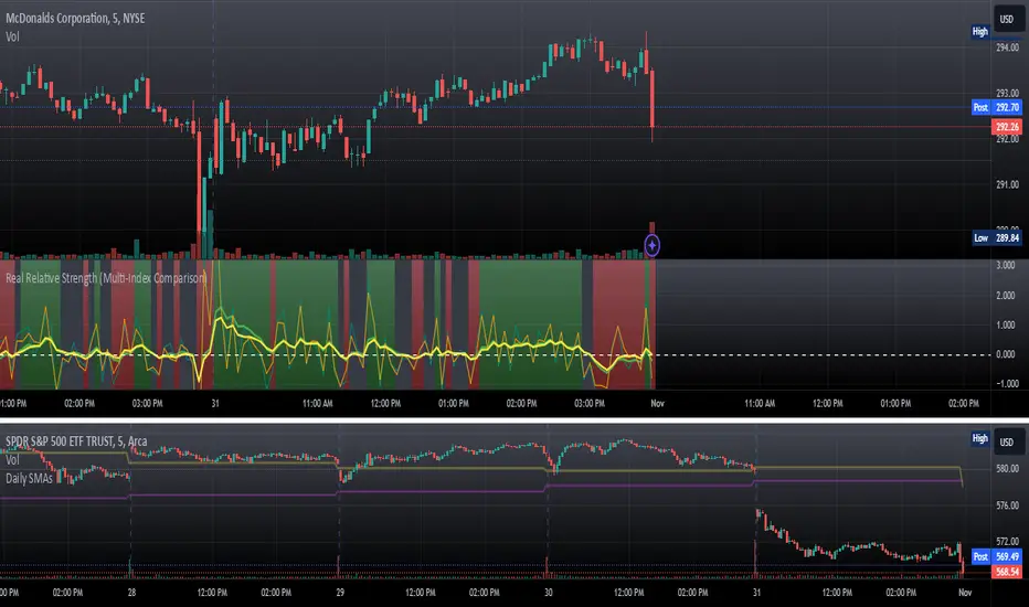 The Real Relative Strength (RRS) indicator implements the "Real Relative Strength" equation, as detailed on the Real Day Trading subreddit wiki. This equation measures whether a stock is outperforming a benchmark (such as SPY or any preferred ETF/index) by calculating price change normalized by the Average True Range (ATR) of both the stock and the indices it’s being compared to.The RRS metric often highlights potential accumulation by institutional players. For example, in this chart, you can observe accumulation in McDonald’s beginning at 1:25 pm ET on the 5-minute chart and continuing until 2:55 pm ET. When used in conjunction with other indicators or technical analysis, RRS can provide valuable buy and sell signals.