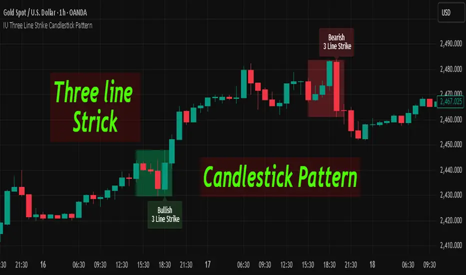 This indicator identifies the Three Line Strike candlestick pattern — a rare yet powerful 4-bar reversal setup that captures exhaustion and momentum shifts at the end of strong trends.