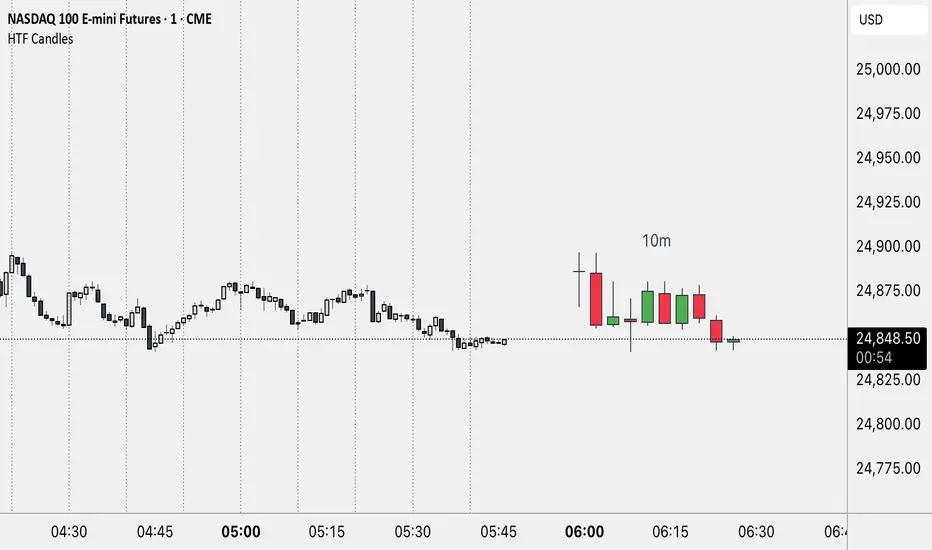 The goal is to simplify HTF analysis without the need to switch timeframes and detect HTF candle patterns while seeing the lower timeframe develop in realtime.