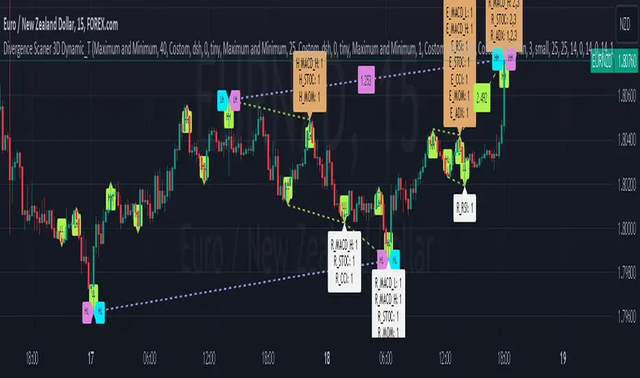 This indicator can label the last 5 divergences for positive and negative divergences and for all three scans. Also display the Fibonacci level for the last divergence.