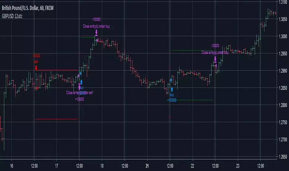 You will get a signal (long or short) at 12utc, and some corsses will appear to sel Stop Loss and Take Profit (green for the long positions and red for the short ones). After one hour the crosses will become lines, and if none of them will be hit, you will have to close manually from 11 to 12 utc of the day after.