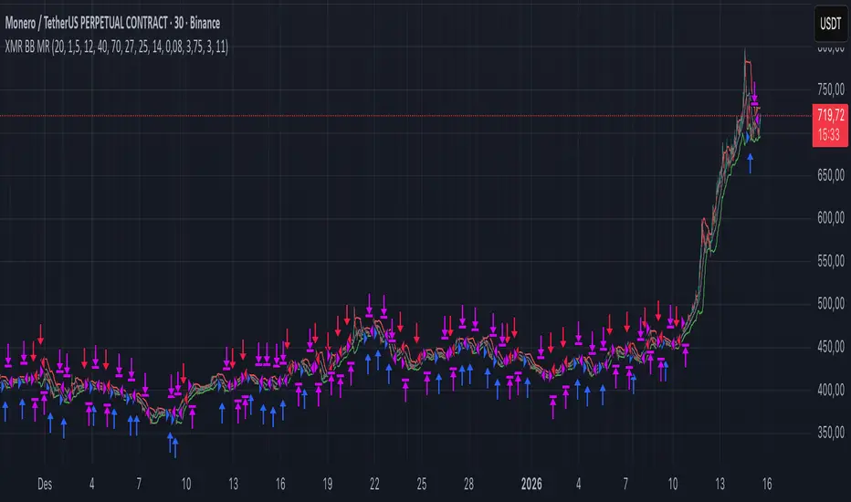 This strategy is a mean-reversion system designed for $BINANCE:XMRUSDT (originally tuned on 30m). It looks for price excursions outside Bollinger Bands and trades the reversion back toward the moving average, while filtering for “ranging” conditions using an ADX cap and a minimum ATR% (to avoid dead markets).
