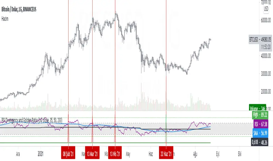 As can be seen in the image, the points marked with red are the regions where incompatibility occurs. At the same time, the signals that occur when the RSI cuts its own moving average and the signals that occur when the RSI cuts its own golden ratio are also very strong signals.