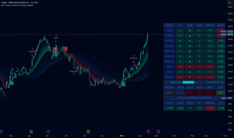 MTF Screener MA Cross System is a multi-timeframe analytical framework that integrates moving average cross logic, higher timeframe context, risk modeling and multi-symbol monitoring within a unified interface.