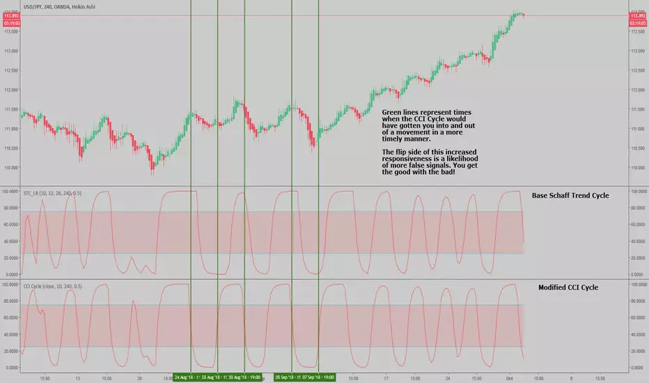 I've been a huge fan of the STC for a long time, but being based on the MACD means its signals often lag by a bar or two (especially in fast moving markets). All I've done here is take the base STC script (all credit to user LazyBear), and change the source to a modified CCI.