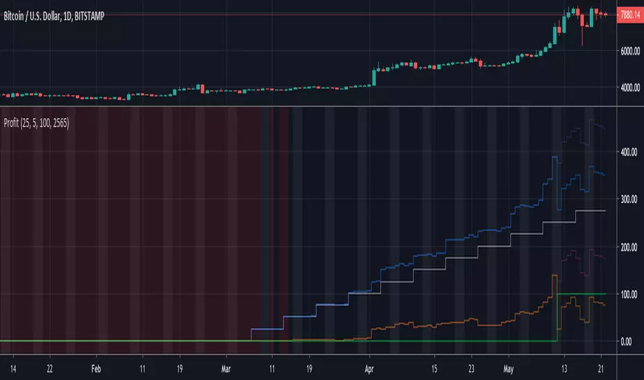 This simple indicator shows gains/ losses and profit taking opportunities for a strategy that consists of regularly investing a static sum to an asset (ex: adding $25 to BTC every week).