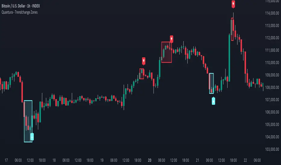 The “Quantura – Trendchange Zones” indicator works across all markets and timeframes, including cryptocurrencies, Forex, stocks, and commodities. It is suitable for both short-term scalping and long-term swing analysis.