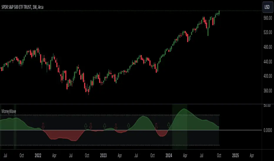 Background Colors: The background changes to green when the MoneyWave exceeds the upper threshold (overbought) and red when it falls below the lower threshold (oversold), providing immediate visual cues about market conditions.