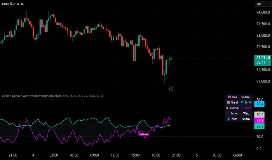 The 2-Wave Probability Engine is a probability-driven market structure tool built to help traders interpret trend strength, trend continuation, potential reversal pressure, and chop zones using two clean, smoothed probability waves.