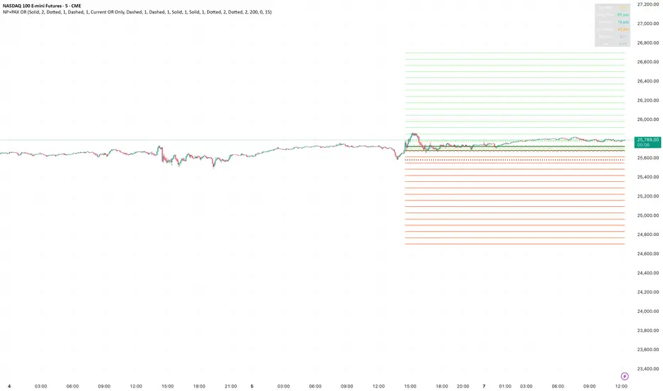 PAX-OR is a high-precision, automated Opening Range indicator designed specifically for Futures Traders. Unlike standard OR indicators that require manual time inputs, PAX-OR automatically detects the asset class (Indices, Metals, Energies) and configures the correct Opening Time, Point Value, and Volatility "Rungs" without manual intervention.