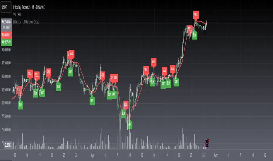 The [blackcat] L3 Dynamic Cross indicator is a powerful tool designed to assist traders in identifying potential buy and sell opportunities through the use of dynamic moving averages. This versatile script offers a wide range of customizable options, allowing users to tailor the moving averages to their specific needs and preferences. By providing clear visual cues and generating precise crossover signals, it helps traders make informed decisions about market trends and potential entry/exit points 📈💹.