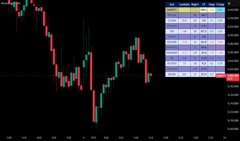 📌 Note: Due to internet connectivity, data delays, or broker feeds, real-time values (LTP, change, contribution, etc.) may slightly differ from other platforms or terminals. Use this indicator as a supportive visual tool, not a sole decision-maker.