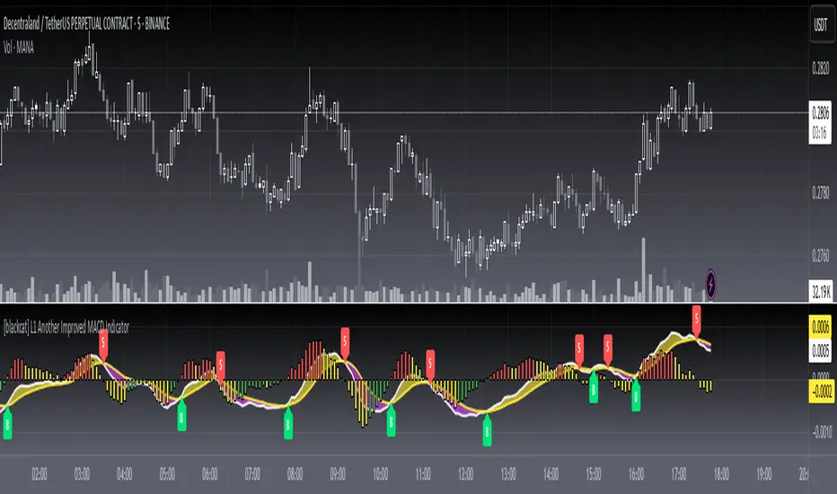 OVERVIEW The [blackcat] L1 Another Improved MACD Indicator provides an advanced interpretation of the classic MACD oscillator with enhanced visualization tools. This script combines exponential moving averages (EMAs), dynamic coloring schemes, and real-time buy/sell signal markers to improve trading decision-making.