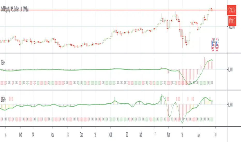 If the TSV value meets the long and short signal requirements above and TSV is greater than the threshold values a green or red box will print ABOVE the oscillator. The histogram will also change color based on which threshold TSV has met.
