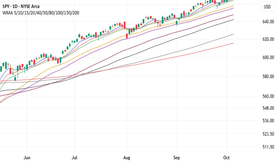 Choose your best combination of Weighted Moving Averages (WMAs). Do not select more than three. As a rule of thumb, multiple by 4 or 5 to choose longer WMA or divide by 4 or 5 to choose shorter WMA. Have a good trade!!