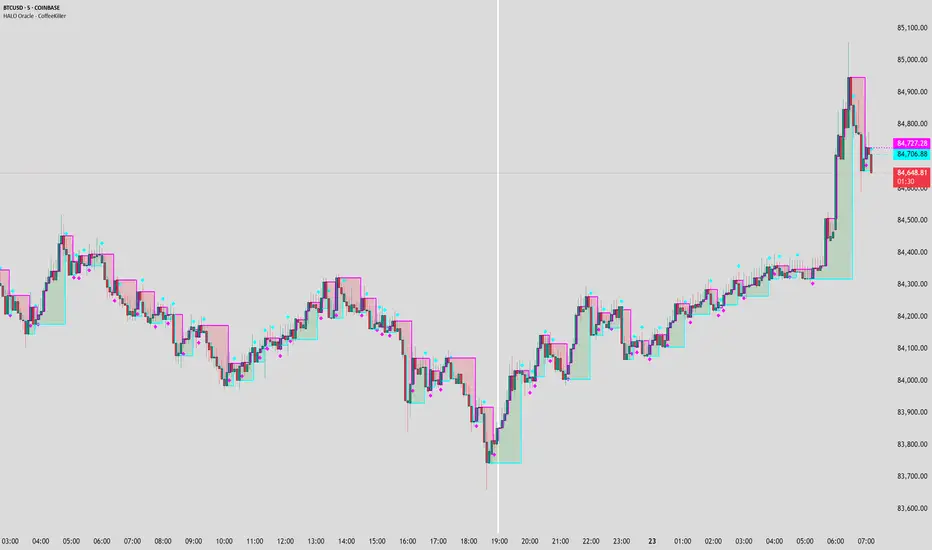 The HALO Oracle is a trend-following indicator that combines Heiken Ashi candles with golden ratio calculations to help you identify market direction and key price levels.