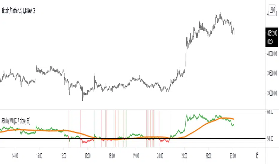 - RSI background turns green and red on crossover candle based on whether RSI just crossed over or below 50 respectively