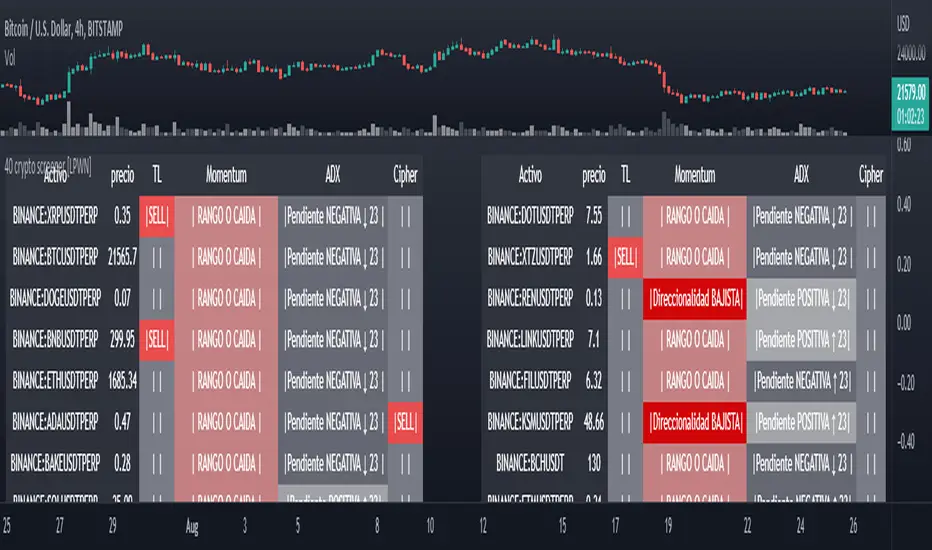 This indicator shows two tables, with 10 assets each, they can be currencies, stocks or cryptos, the columns can be changed to the information you want to see, among the options are price or change (change in percentage of the candle in the temporality where you are seeing it), TL are buy or sell signals according to the Latin trading strategy (Squeeze momentum combined with ADX) buy if the momentum changes to range or rise and the ADX has a negative slope, sell if the momentum changes to range or fall and The ADX has a negative slope, the signals are not 100% effective, you must support it with price action and market speculation, directionality in the momentum, slope of the ADX, if there is divergence in the momoentum squeeze, lux something and cipher use an indicator of Lazy bear, lux something signals when two wave trends cross and the cipher signals when the wave trend crosses above or below the 0 point.