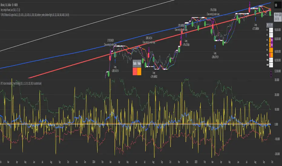 since the Genesis Block, resulting in diminishing but predictable returns. Backtested over Bitcoin's full history, the strategy boasts a 77% winning rate and a profit factor of 3.2, making it a robust tool for trend-following with mean-reversion elements. It emphasizes Bitcoin's long-term stability while navigating short-term oscillations, treating cycles as temporary deviations from the core power-law "DNA.