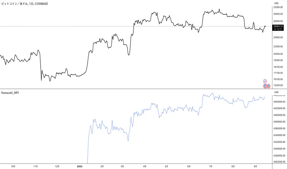 The Kawasaki_MFI indicator is a customized technical analysis tool developed to analyze asset prices in financial markets. This script is implemented in TradingView's Pine Script language (version 5) and is based on the concept of the Accumulation/Distribution Line (ADL) which is a volume-based indicator designed to measure the cumulative flow of money into and out of a security.
