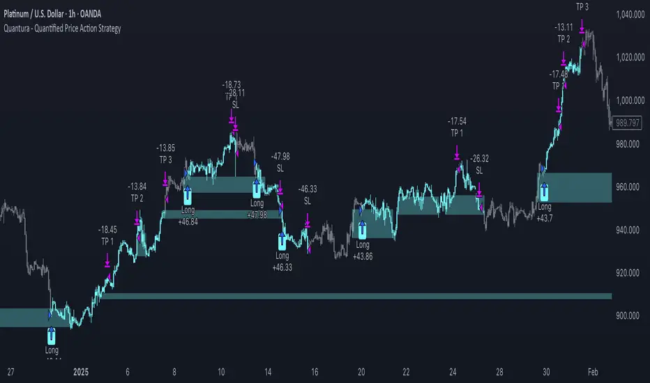 “Quantura – Quantified Price Action Strategy” is an invite-only Pine Script strategy designed to combine multiple price action concepts into a single trading framework. It integrates supply and demand zones, liquidity sweeps and runs, fair value gaps (FVGs), RSI filters, and EMA trend confirmation. The strategy also provides a visual overlay with dynamic trend-colored candles for easier chart interpretation. It is intended for multi-market use across cryptocurrencies, Forex, equities, and indices.