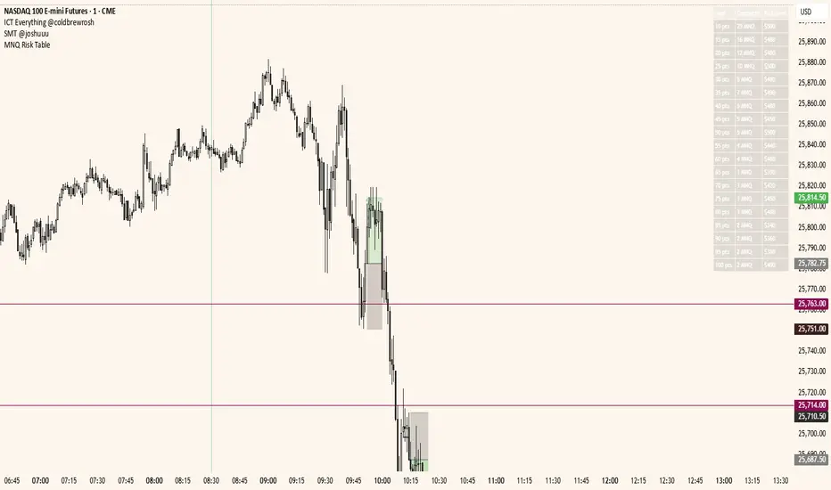 It generates a transparent on-chart table that shows your stop size (points), the recommended MNQ contracts, and the total risk used based on your chosen dollar risk.