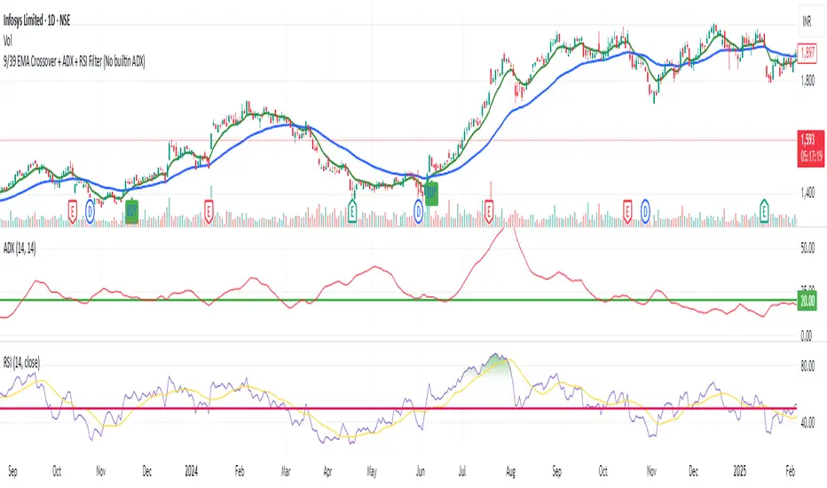 9/39 EMA Crossover + ADX + RSI Filter (No builtin ADX)