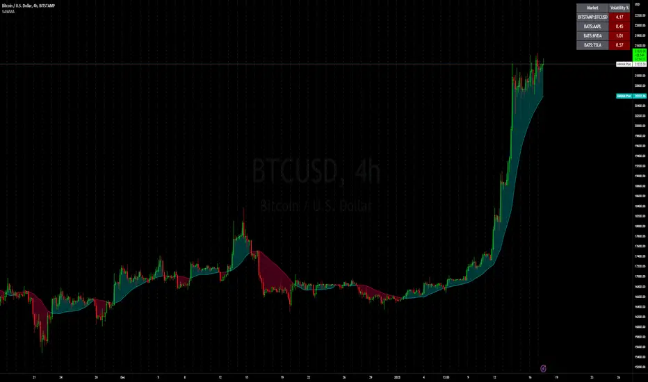 The Volatility Weighted Moving Average is a short and long term trend filter that weightes asset price buy "volatility significance" (percentages of total volatility over specified period) unlike that of the WMA which formulates an average based on the product of asset price and a deceding period significance . The result is a less noisy average which weights price based on its potential significance in trend, VAWMA tends to price when volatility is high and conversaly tends away from price when volatility is low.