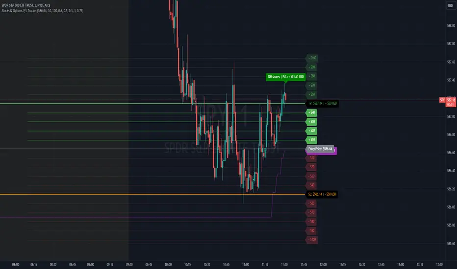 The Stocks & Options P/L Tracker is a custom TradingView indicator developed to offer traders precise tracking of stocks & options trades’ profit and loss in real-time. It features a detailed display of P/L intervals, stop-loss and take-profit levels, and an adaptable trailing stop mechanism to help traders manage risk and optimize their trading strategies. This tool is particularly useful for active traders who seek immediate visual feedback on their trades’ performance.