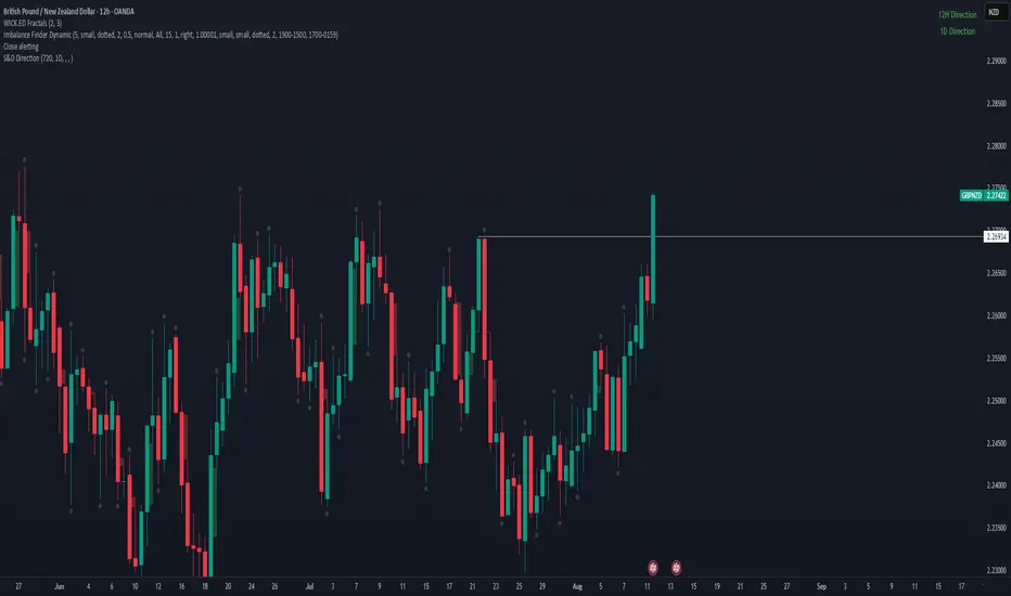 This indicator displays the most recent candle close direction for up to five custom timeframes, as selected in the settings. For each chosen timeframe, it shows whether the last confirmed candle close was bullish (close above the previous high) or bearish (close below the previous low). The indicator labels each timeframe in the top right corner, using green text for bullish closes and red for bearish closes. The displayed timeframes can be customized, and the direction (long/short) is clearly shown after each label.Sürüm Notları
