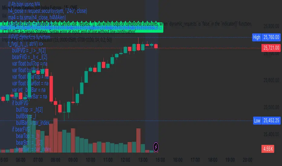 This indicator provides ICT-style multi time frame fair value gaps with a 4-hour moving average bias. It prioritizes 15-minute gaps and falls back to 5-minute and 1-minute gaps when none are present. It also includes alert conditions for long and short signals based on session filters and bias.