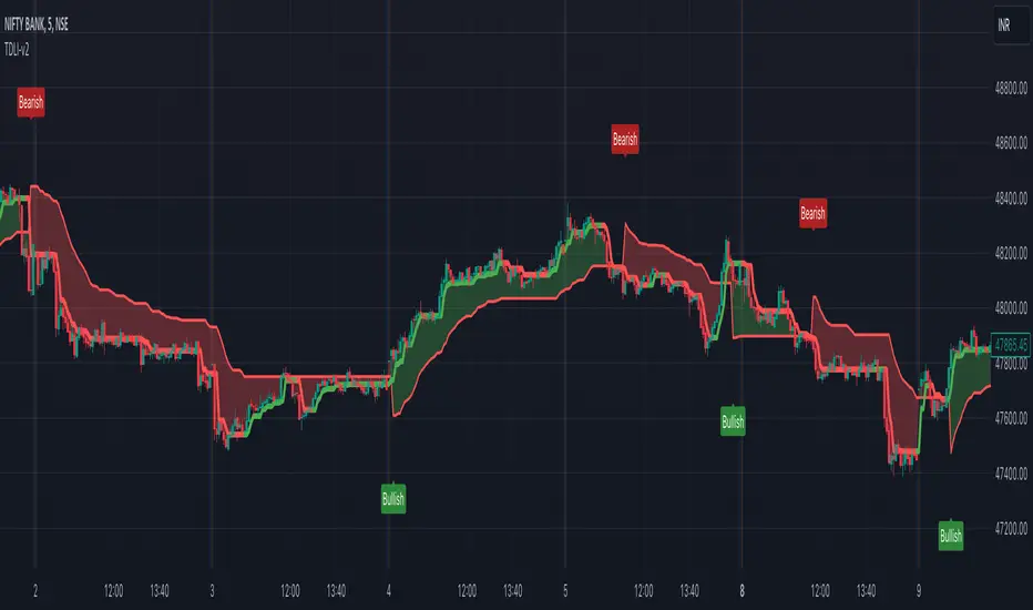 The indicator may be considered valuable for traders who appreciate a visual representation of market trend direction and important stop levels. Normal indicators like supertrend just shows a line which gives you idea about the trend but our indicator apart from telling trend direction tells important levels and provide a channel filled with current trend direction significance which helps in following trend precisely.