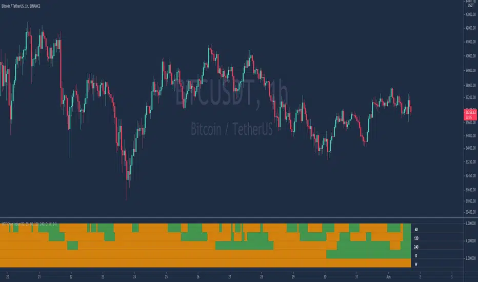 You can set five different timeframes, set triggering chop value above which the bar will turn green.