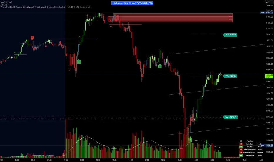 Prop Algo is a multi-tool trading assistant that blends trend following, contrarian timing, and Smart Money Concepts (SMC). It plots clean buy/sell labels, paints candles by momentum state, maps TP/SL levels automatically, shows a compact **Smart Panel** (dashboard), and draws **auto-trendlines**, **trend clouds**, and **institutional zones** (OB/BB/MB). It’s built to help discretionary traders make faster, rules-based decisions without drowning in settings.