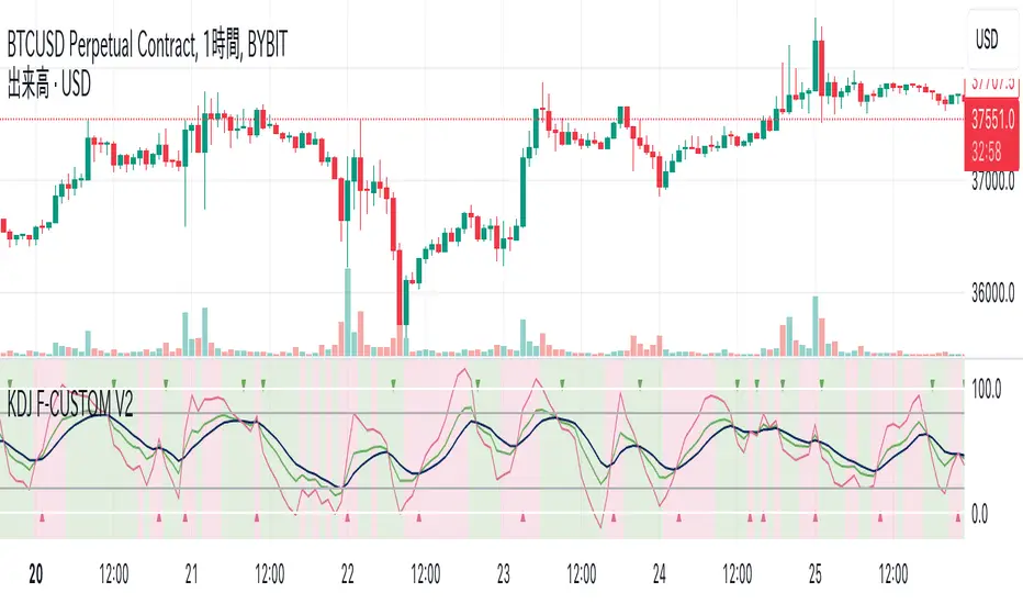 KDJ F-CUSTOM V2 IndicatorThe "KDJ F-CUSTOM V2" is a customized version based on the classic KDJ indicator. This indicator is designed to suggest overbought and oversold conditions in the market. The KDJ consists of three lines: %K (pK), %D (pD), and %J (pJ), which help identify market momentum and potential trend reversal points.