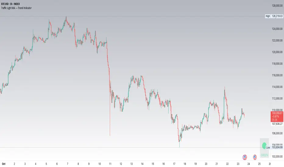 This script displays a simple “traffic light” circle that reflects the market trend based on two moving averages (MA).