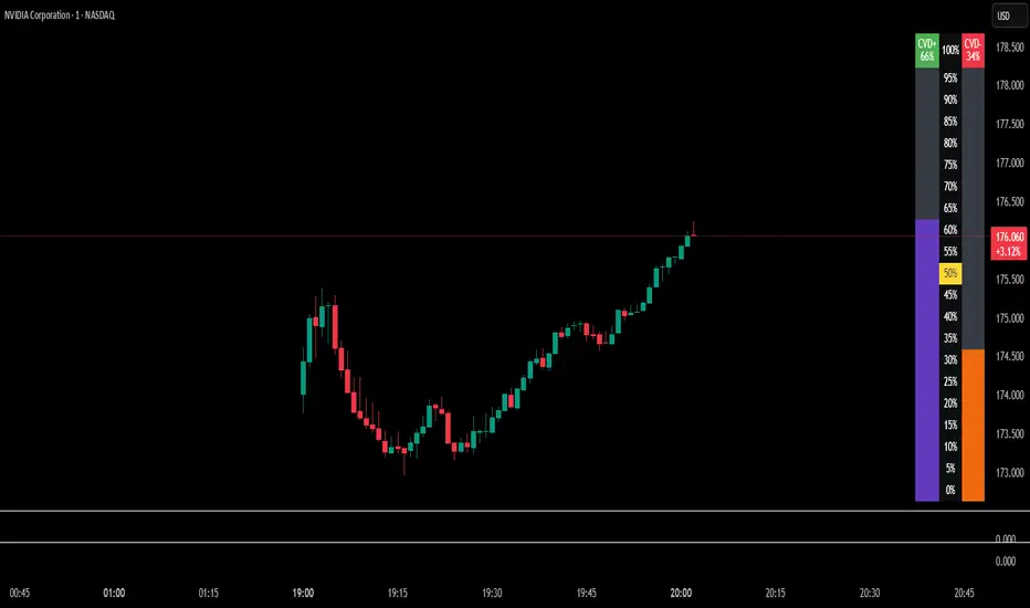 Visual Thermometer Display: Presents buying (CVD+) and selling (CVD-) dominance in colorful vertical bars on an easy-to-read table overlay on the price chart.