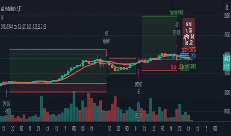 Swing trading bot strategy. This indicator uses Dema 8 and Dema 24 crosses to throw buy and sell signals. You can also se take profit and stop loss parameters
