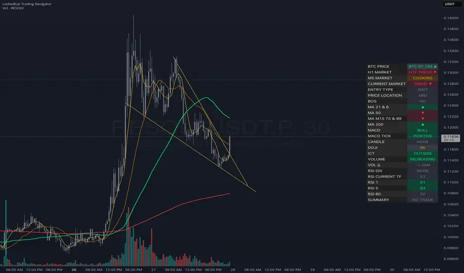 It identifies market state (trend or consolidation), detects breakout, pullback, and liquidity sweep conditions, tracks multiple moving averages, monitors MACD and RSI momentum, shows volume and volume delta, and confirms higher timeframe bias. All signals are summarized in a single table for fast decision-making.