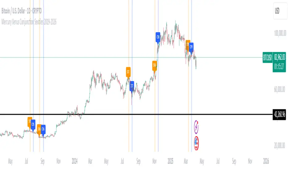 This Pine Script, called "Mercury Venus Aspects 2019–2026," is made to highlight the dates of Mercury-Venus conjunctions (0°) and sextiles (60°) from 2019 to 2026 on TradingView charts. Here's how to use it: