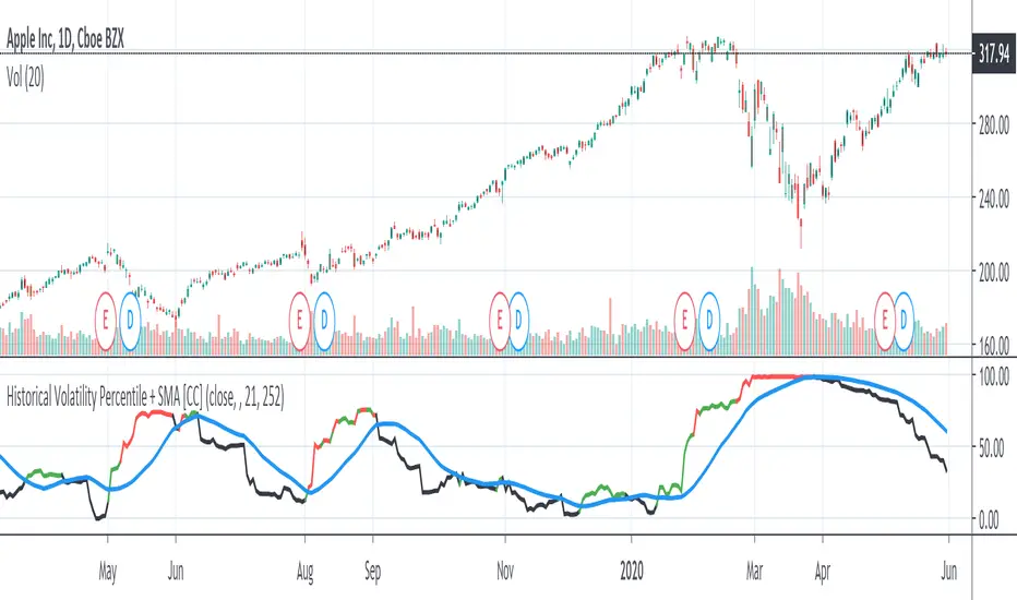 Historical Volatility Percentile tells you the percentage of the days from the past year (252 trading days) that have lower volatility than the current volatility.