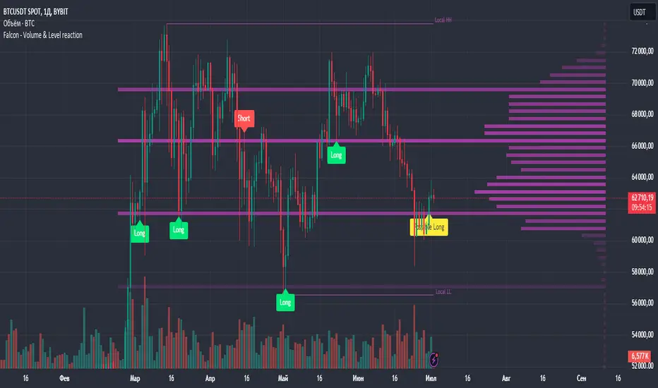 Our indicator, Falcon - Volume & Level Reaction, is designed to provide traders with comprehensive insights into price behavior through the calculation of horizontal volume profiles. By analyzing these profiles, the indicator identifies key levels and assesses price reactions, offering valuable trading signals.