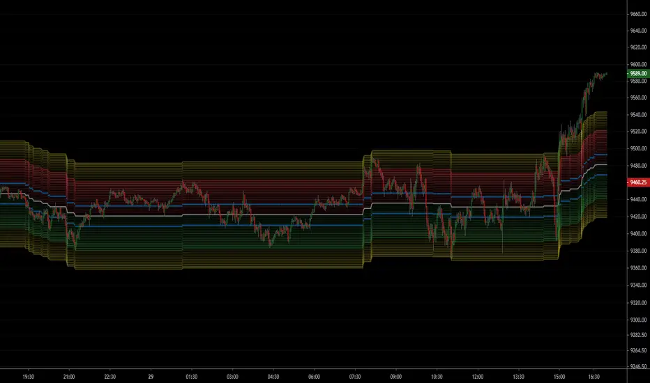 **DESIGNED FOR NQ/MNQ** This script provides an easy visualization of potential reversion zones to take trades back to the intraday midline. A common use would be to enter a position once price reached the outer yellow zones and retreats to either the red zone (for a short toward the midline) or a green zone (for a long back to the midline).