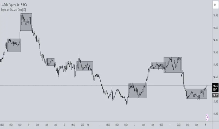 This indicator dynamically detects and visualizes key support and resistance zones by aggregating price data into synthetic candles. It highlights these critical price areas as shaded boxes that adjust in real-time, providing traders with clear visual cues on where price might find support or resistance.